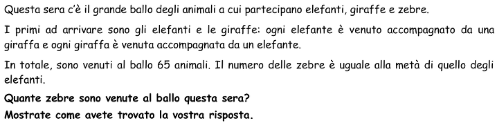 - Capire i vincoli del problema: ci sono tante giraffe quanti elefanti, il numero delle zebre è uguale alla metà del numero degli elefanti e quindi anche alla metà del numero delle giraffe.