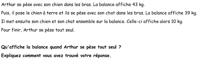 Ou, des deux premières pesées, déduire que le chien pèse 4 kg de plus que le chat. Sachant que le chien et le chat pèsent ensemble 10 kg et que la différence entre les deux masses, celles-ci ne peuvent pas être 5 et 5, 6 et 4. On trouve ainsi 7 et 3. En retirant la masse d’un animal de la pesée faite par Arthur avec cet animal dans les bras, on trouve qu’Arthur pèse 43 - 7ou 39 - 3, soit 36 kg.