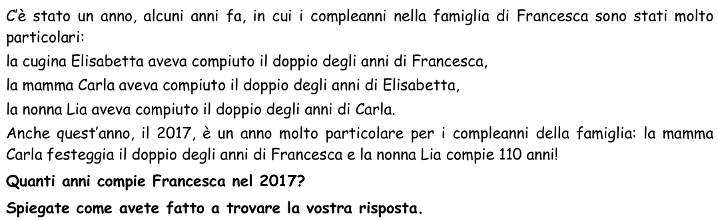 - Rendersi conto che le relazioni fra le età si modificano con il passare degli anni e che nel 2017 l’età di ciascuna persona aumenta dello stesso numero (di anni) e che l’età dell’una non è più il doppio della precedente; in particolare Carla, che aveva quattro volte l’età di Francesca, ne avrà solamente il doppio nel 2017.