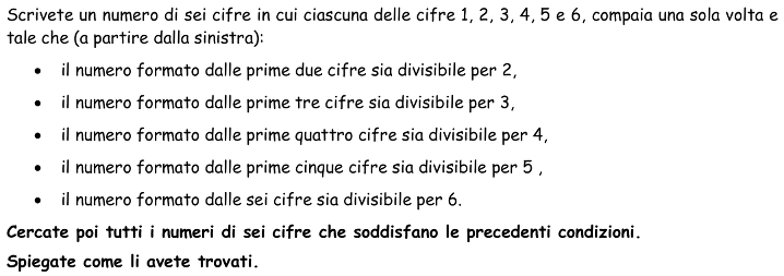 Trovare i numeri formati dalle sei cifre 1, 2, 3, 4, 5, e 6, divisibili per 6, tali che il numero formato dalle prime cinque cifre sia divisibile per 5, quello formato dalle prime quattro cifre sia divisibile per 4, quello formato dalle prime tre cifre sia divisibile per 3 e quello formato dalle prime due sia divisibile per 2.