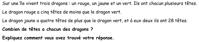 - Comprendre que les nombres de têtes de chaque dragon ne sont pas connus mais que, à partir de la première condition, la différence, 5, entre les nombres de têtes du dragon rouge et du dragon vert est connue, tandis qu'à partir de la deuxième condition, la différence, 4, entre le nombre de têtes du dragon jaune et vert est connue, mais aussi leur somme, 28.