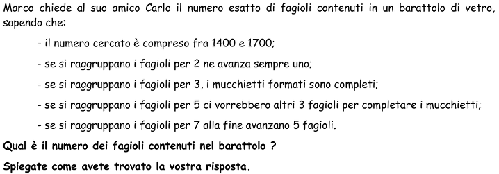 Determinare l’unico numero compreso tra 1400 e 1700 sapendo che i resti delle divisioni di questo numero per 2, 3, 5 e 7 sono, rispettivamente, 1, 0, 2 e 5.
