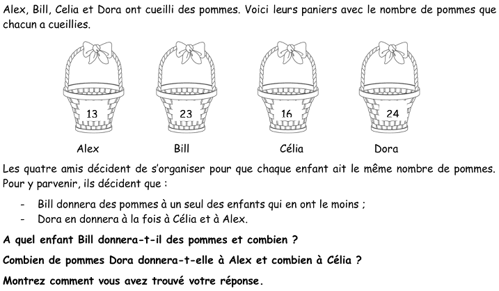 - Procéder par essais et ajustements (simulation de distribution), en respectant les contraintes de l’énoncé, par exemple : Bill en donne 2 à Alex : il en a 21 et Alex en a 15. Si Dora veut en avoir 21, elle doit en donner 3 mais alors Alex et Célia n’en auront pas 21. Il faut donc que Bill en donne davantage… et continuer jusqu’à ce que chaque enfant ait le même nombre de pommes.