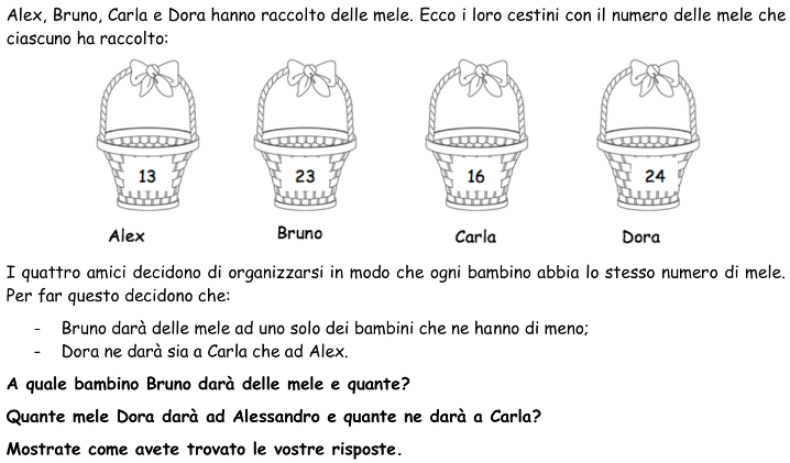 - Procedere per tentativi e aggiustamenti (ipotesi di distribuzione), rispettando i vincoli dell’enunciato, per esempio: Bruno ne dà due ad Alex, lui ne avrà 21 e Alex 15. Se Dora vuole averne 21, deve cederne 3, ma né Alex né Carla ne avranno 21. Occorre dunque che Bruno ne dia di più... e continuare fino a che ciascun bambino avrà lo stesso numero di mele.