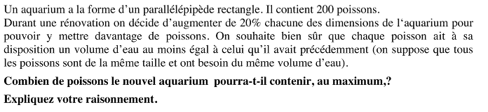 Trouver l’augmentation du volume d’un parallélépipède rectangle dont on augmente toutes les dimensions de 20 % (sans données numériques) et appliquer cette transformation à une deuxième grandeur proportionnelle au volume, dans un contexte d’un acquarium et de poissons.
