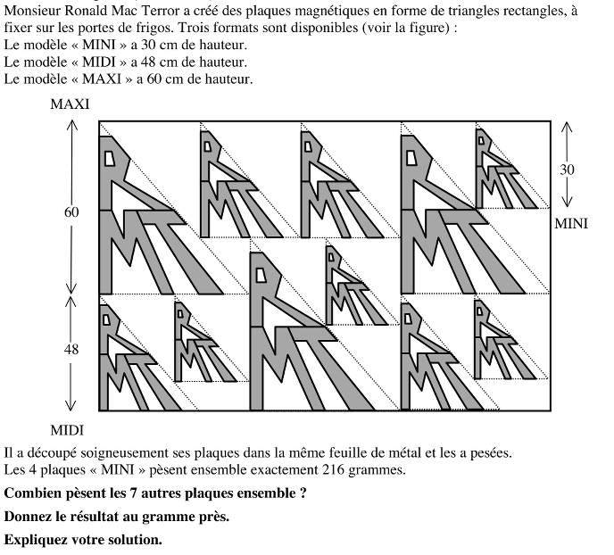 Une erreur attendue consiste à considérer que les masses des plaques sont proportionnelles à leurs hauteurs (et non à leurs aires), ce qui conduit aux masses des modèles MAXI et MIDI respectivement de 108 = 54 x 2 et de 86,4 = 54 x 1,6 et à la masse des sept pièces (3 x 108) + (4 x 86,4) = 669,6.