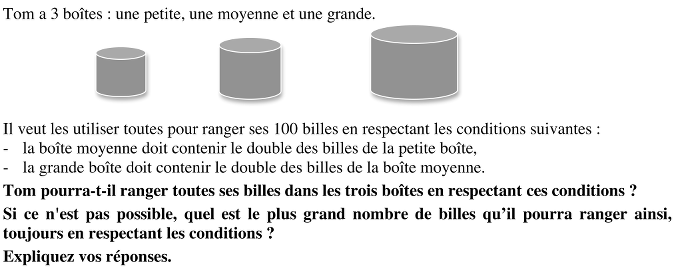 - Procéder par essais et ajustements en respectant les conditions (par exemple essayer avec 10 billes dans la petite boîte, 20 dans la boîte moyenne et 40 dans la grande : on range 70 billes, trop peu ; essayer, par exemple, avec 15 et trouver qu'on range ainsi 105 billes, trop. Faire d’autres essais et trouver qu'avec 14 billes dans la petite boîte, on range 98 billes en tout, c’est le maximum possible).