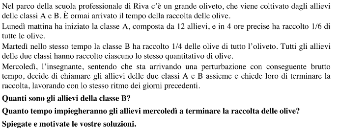 Trovare il numero di persone di un gruppo che fanno 1/4 di un lavoro quando 12 persone di un altro gruppo ne fanno 1/6 nello stesso tempo, 4 ore, con lo stesso risultato. Poi trovare qual è il tempo necessario per fare il restante lavoro quando i due gruppi lavorano insieme. In un contesto di raccolta di olive.