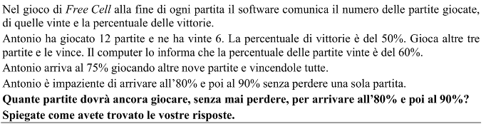 - Verificare che quando Antonio ha giocato e vinto altre 3 partite è arrivato a 9 partite vinte su 15 giocate, ciò che corrisponde a 9/15 = 3/5 = 60/100 o 60%. Verificare poi che dopo altre 9 partite vinte, egli raggiunge il rapporto 18 partite vinte su 24 partite giocate ciò che corrisponde a 18/24 = 3/4 = 75/100 o 75 %.