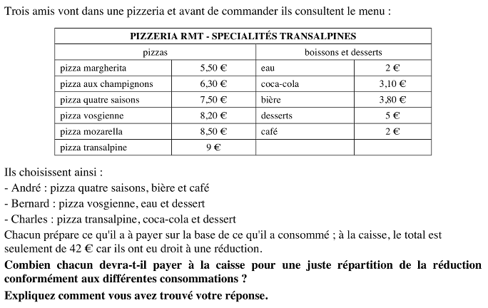 - Un premier examen, rapide, des copies de Suisse romande (catégories 7 et 8 seulement) montre que l’erreur « classique » et très majoritaire en catégorie 7 est de répartir le rabais de 3,60 euros en trois rabais de 1,20 euros pour chacun des trois amis, sans se rendre compte que celui qui a consommé le plus devrait avoir un rabais plus important que celui qui a consommé le moins. Il est vrai que, à leur défense, il ne s’agit que de quelques centimes qui ne constituent pas une grande injustice !