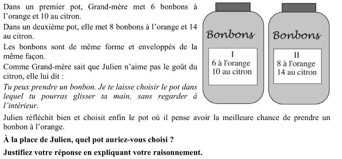 - Retenir les données: 6 bonbons à l'orange et 10 au citron dans le premier, 8 et 14 dans le second et la demande choix du pot dans lequel on a plus de chances de tirer un bonbon à l'orange, en étant conscient que les tirages sont aléatoires et que la réponse n'a rien avoir avec la "bonne fortune" d'un seul individu qui effectue le tirage mais s'applique à "l'infinité" des tirages possible.
