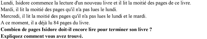 - Une confusion entre le nombre total de pages et les 84 pages lues. Dans ce cas, le problème se réduit au calcul de 42, 21 et 10,5 pages lues respectivement le lundi, le mardi et le mercredi et à la réponse 10,5 pages restant à lire, parfois arrondies à 10 ou 11.