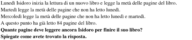Oppure con una procedura algebrica: indicare con x il numero delle pagine del libro e tradurre il problema nell’equazione (x/2) + (1/2)(x/2) + (1/2)(1/2)(x/2) = 84 la cui soluzione è x = 96. Quindi calcolare 96 -84 = 12 che è il numero della pagine che restano da leggere.