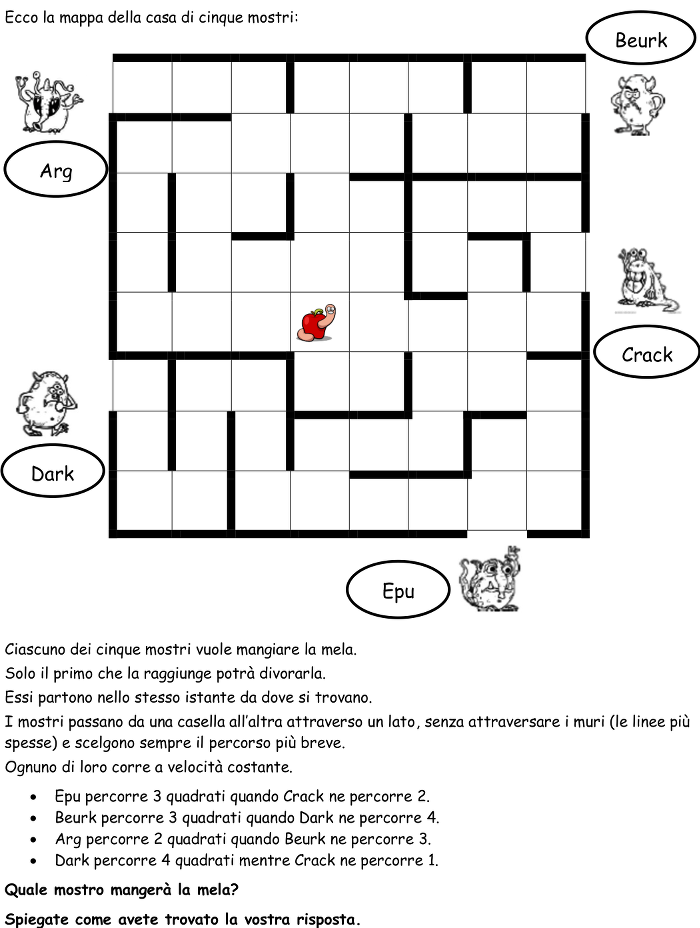 - Per la condizione 3, Beurk arriva prima di Arg: in un certo momento dei loro percorsi, essi si ritrovano entrambi sullo stesso quadretto e in tale momento rimangono 2 quadrati a ciascuno per arrivare alla mela, ma poiché Beurk corre più velocemente di Arg (per la condizione 3), allora Beurk arriva prima di lui.
