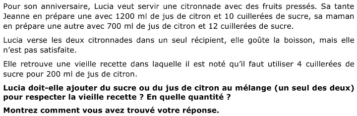 Dans le contexte d’une recette à deux ingrédients, étant données deux quantités déjà préparées à mélanger, trouver de combien il faut augmenter la quantité d’un des ingrédients pour respecter la proportionnalité des ingrédients donnés dans la recette d’origine.