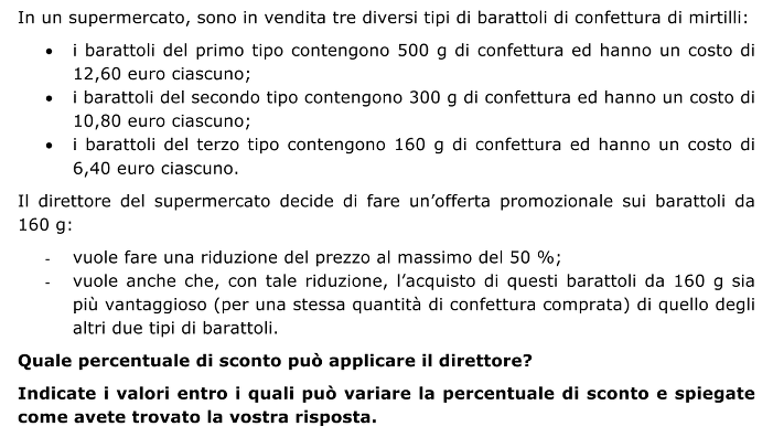 - Determinare le percentuali di sconto che è possibile applicare sul prezzo dei barattoli da 160 g per ottenere un prezzo al kg inferiore a 25,20 €. Per esempio 20 € darebbe uno sconto del 50%. Questo deve essere almeno di (1– 25,20/40) = 0,37 = 37% per avere 25,20 al kg.