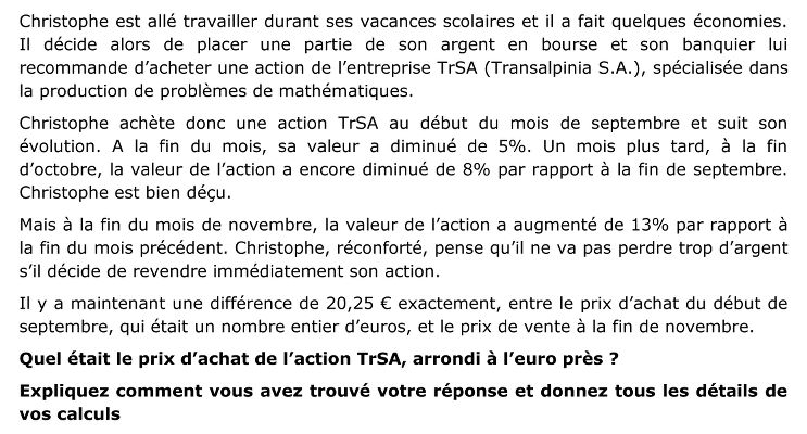 Trouver le prix initial d’une action qui, après deux baisses successives de 5 % puis de 8 % et suivies d’une hausse de 13%, a subi une différence de valeur de 20,25 € avec sa valeur initiale.