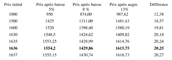 - Procédure par essais, globale : Au cas où les trois transformations sont composées 0,95 × 0,92 × 1,13 = 0,98762, le tableau ci-dessus présentera deux colonnes de moins. Finalement, retenir les valeurs de l’action qui correspondent à une différence (baisse) de 20,25 € dans le tableau, soit de 1636 €.