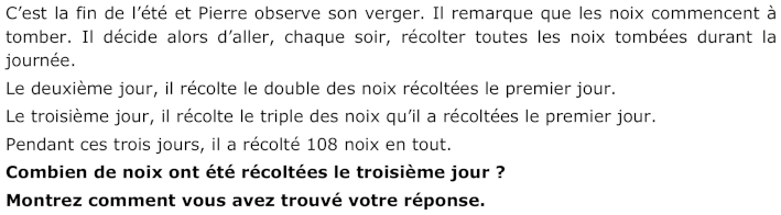 Se représenter la répartition de 108 noix récoltées les trois jours selon les indications: nombre du premier jour encore indéterminé, son double et son triples pour les deuxième et troisième jour.