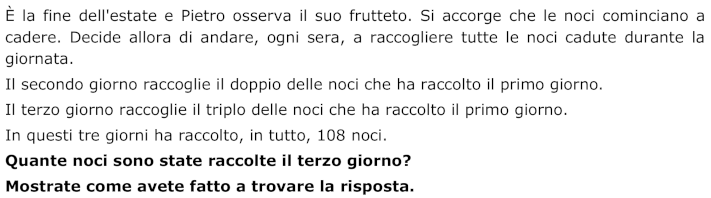 Immaginare la distribuzione di 108 noci raccolte in tre giorni secondo le indicazioni: numero del primo giorno ancora indeterminato, suo doppio e suo triplo per il secondo e terzo giorno.