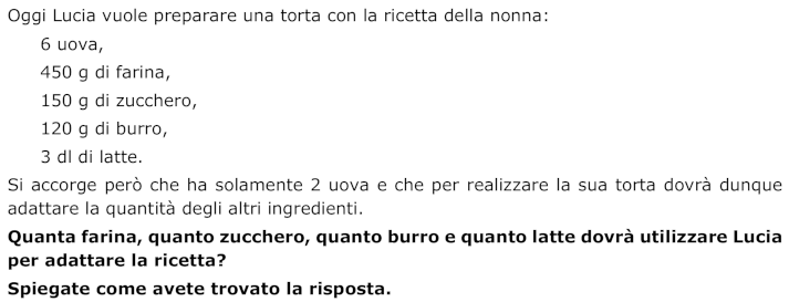 - Comprendere che la situazione riguarda quantità diverse: numero di uova e quantità di farina, zucchero, burro e latte e che la rispettiva quantità di ingredienti deve essere "diminuita" in base al numero di uova che va da 6 a 2.