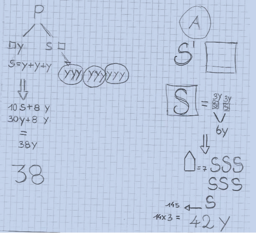 - Dessin des 7 A correspondant à 42 Y, + 8 Y pour arriver à 50 Y et division de 50 par 3 pour trouver 16 P et reste 2 Y avec réponse cohérente Paolo a utilisé 2 de ses seaux et 2 Y en plus.