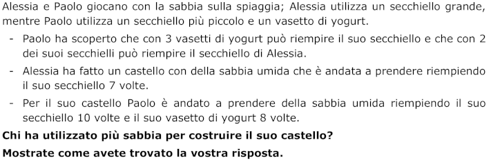 - Alessia ha usato più sabbia perché anche se ha usato 7 dei suoi secchielli e Paolo 10 secchielli e 8 vasetti, Alessia ha usato più sabbia perché per riempere un secchoiello di lei ci vuole 2 secchietti di Paolo.