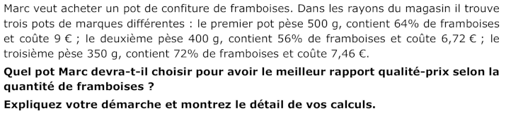 - Comprendre qu’il faut commencer par calculer la masse de framboises contenue dans chaque pot de confiture et calculer le prix au kg (ou au g) des framboises.