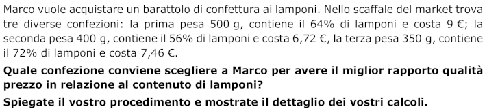 - Concludere che la prima confezione ha un miglior rapporto qualità-prezzo in relazione al contenuto di lamponi.