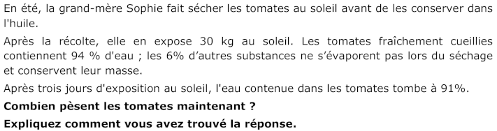 Prendere coscienza della composizione della materia che costituisce i 30 kg di pomodori. I biologi sanno che sono costituiti di 94% d’acqua quando sono freschi; bisogna dedurre che il 6% è costituito da altre sostanze (fibre vegetali e altro…). Sapere che è l’acqua dei pomodori che evapora mentre si espongono al sole o al calore e non le altre sostanze. s de 94 % d’eau lorsqu’elles sont fraîches ; il faut en déduire que 6 % sont formées “d’autres matières” (fibre végétales, … ou “substance tomate”).