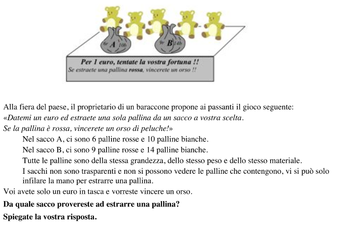 Tra due recipienti contenenti ciascuno due tipi di oggetti (rispettivamente 6 e 10 per il primo, 9 e 14 per il secondo), scegliere quello in cui si deve pescare per vincere un oggetto del primo tipo.