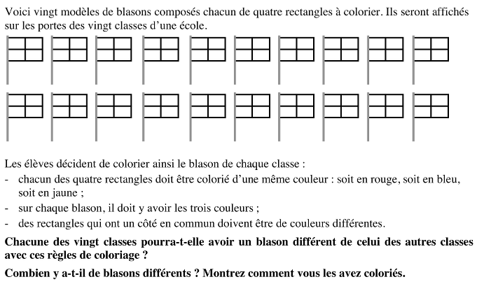 - Comprendre toutes les contraintes (pas de rectangle non colorié, trois couleurs à disposition qui doivent figurer sur chaque blason, une par rectangle, contiguïté, coloriages différents).