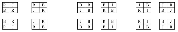 Pour chacune de ces 6 possibilités, il y a ensuite 2 façons de placer les 2 autres couleurs, ce qui fait un total de 2 x 3 x 2 = 12 possibilités.