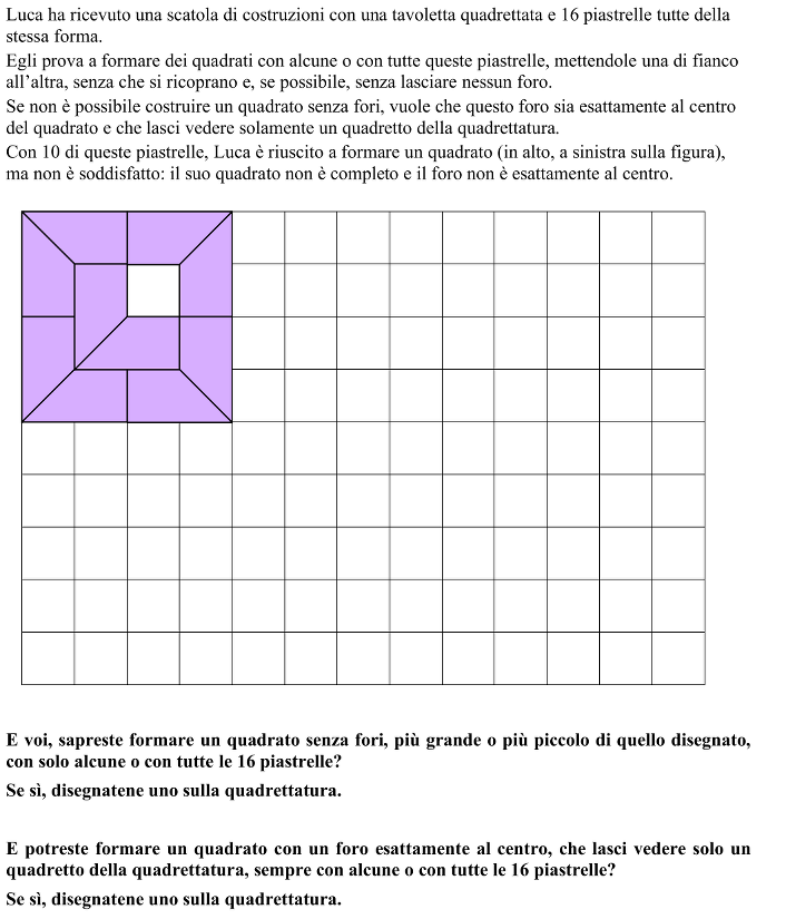 Formare quadrati su una quadrettatura (senza un foro o con, al centro, un foro di un quadretto della quadrettatura) usando pezzi che hanno la forma di un trapezio rettangolare (costituito da un quadretto e un mezzo quadretto ). È possibile utilizzare al massimo 16 pezzi.