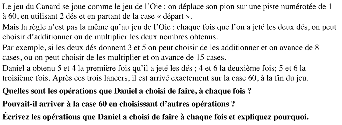 - Effectuer les trois multiplications, trouver les trois produits 20, 24 et 30 (dont la somme est 74) ; effectuer les trois additions, trouver les trois sommes 9, 10 et 11 (dont la somme est 30), constater qu’il faudra obligatoirement choisir une addition et deux multiplications ou une multiplication et deux additions pour arriver à 60.