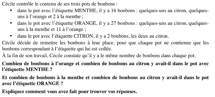- Considérer alors tous les couples de nombres naturels dont la somme est 14 : 1+13; 2+12; 3+11; 4+10; 5+9; 6+8; 7+7 ou, dans chaque somme, les termes sont soit des bonbons à l’orange ou soit au citron se trouvant dans le pot MENTHE. Puisqu’il ne manque que 4 bonbons à l’orange (11 sont déjà dans le bon pot) la seule décomposition qui convient est 4+12. En déduire que dans le pot MENTHE il y avait 4 bonbons à l’orange, 10 au citron (en plus des 2 à la menthe).