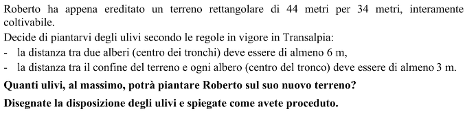 - Tenere in considerazione la condizione sulle distanza tra gli alberi e i confini del terreno e constatare che la superficie sulla quale si possono piantare gli ulivi è un rettangolo centrale di 38 (44 – 2 x 3) per 28 (34 – 2 x 3) metri.
