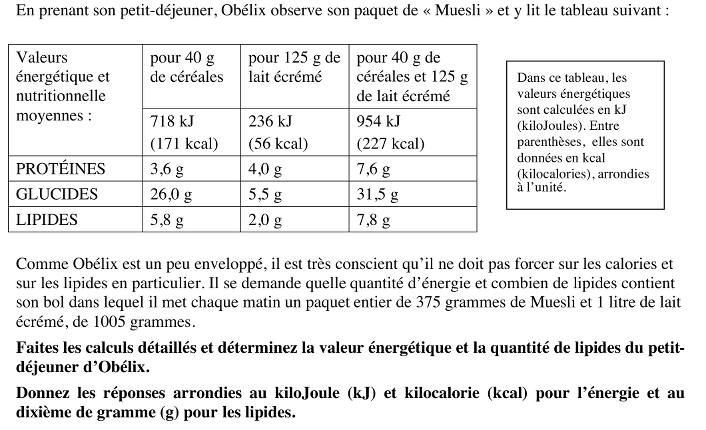 - Déterminer la valeur énergétique du bol d’Obélix en kJ pour les céréales 375 x 718/40 = 6731,25 et pour le lait 1005 x 236/125 = 1897,44 kJ, c’est-à-dire une somme de 8628,69 kJ qui est arrondie à 8629 kJ.