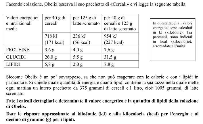 Determinare il numero di calorie e grassi contenuti in una ciotola contenente 375 grammi di Muesli e 1 litro di latte scremato che pesa 1005 grammi. È a disposizione una tabella che riporta i valori rispettivamente di 40 grammi di cereali e 125 grammi di latte.