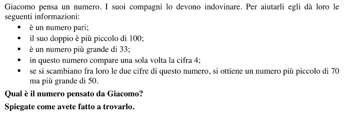 Trovare il numero maggiore di 33, il cui doppio sia minore di 100, in cui solo una delle due cifre sia 4 e in modo tale che, cambiando l'ordine delle due cifre, si ottiene un numero maggiore di 50 e minore di 70.