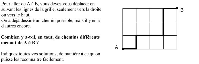 - Organiser une recherche systématique en laissant fixe certains tronçons et en faisant varier les autres (cheminements de couleur différentes, sur plusieurs grilles car les 35 solutions ne se distinguent plus sur le même dessin; codage des cheminements à l'aide de flèches, calculs croisement par croisement à partir du départ, ...)