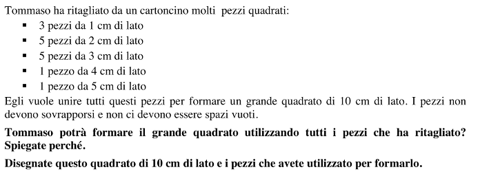 Comporre, se possibile, dei quadrati presi fra: 3 quadrati di 1 cm di lato, 5 quadrati di 2 cm di lato, 5 quadrati di 3 cm di lato, 1 quadrato di 4 cm di lato, 1 quadrato di 5 cm lato, per formare un quadrato con il lato di 10 cm.