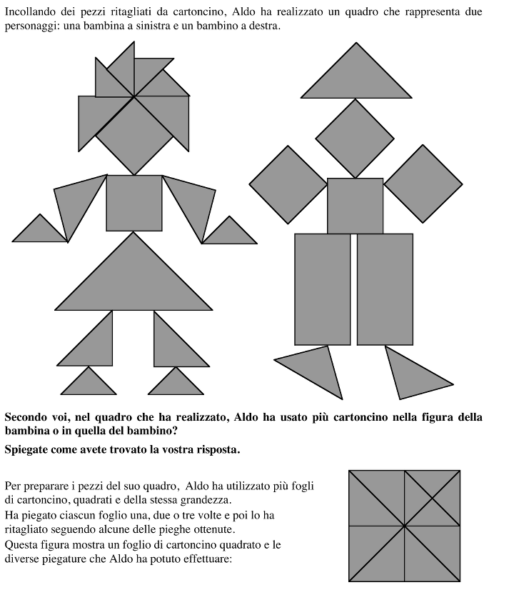 Confrontare le aree di due figure composte da triangoli e quadrati ritagliati da un modello: un quadrato suddiviso in triangoli dalle sue diagonali e mediane.