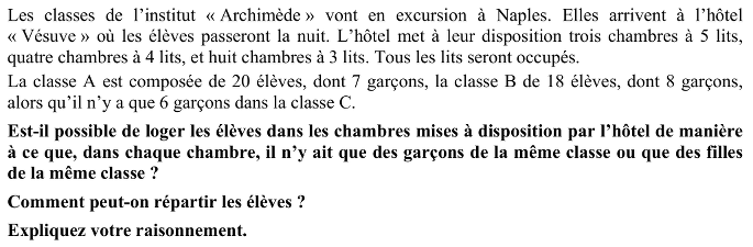 - Comprendre que la distribution de certains groupes d’élèves dans les chambres est imposée : les 7 garçons de la classe A occuperont une chambre triple et une quadruple ; les 6 garçons de la classe C occuperont deux chambres triples.