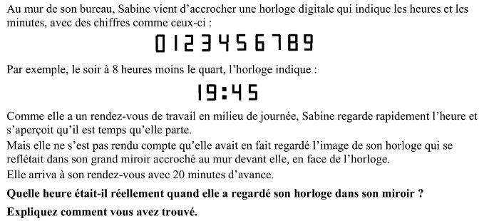 - Se rendre compte que si, par exemple, Sabine lit 11:_ _ dans le miroir, cela signifie qu’il s’agit de _ _ :11 sur l’horloge. D’autre part, les minutes lues sur l’image dans le miroir ne peuvent être que 11 ou 51 vu que leurs images symétriques doivent indiquer sur l’horloge une heure qui soit « proche » de midi, sinon la différence entre l’heure réfléchie et l’heure effective serait trop grande.
