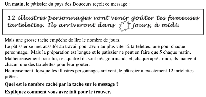 Ou : comprendre que les 7 premiers jours, la fabrication et les pertes reviennent à une production de 1 tartelette/jour et que les 5 tartelettes produites le 8e jour permettent d’atteindre 12.