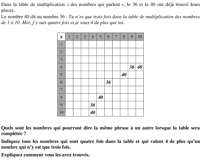 Indiquer les nombres qui figurent 4 fois dans la table de multiplication 10 x 10 et qui valent 4 de plus qu'un nombre qui y figure 3 fois.