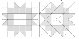 - Tracer les médianes du grand carré ; prolonger les lignes intérieures pour faire apparaître des formes identiques aux quatre formes claires de coin ; réaliser des appariements géométriques entre ces formes et réaliser des appariements entre les triangles blancs et les triangles gris ; constater l’égalité des aires.