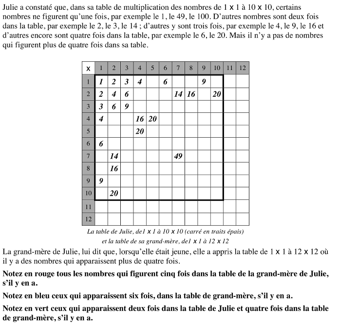 - Comprendre la véracité du texte qui décrit la table de Julie et la présence de nombres apparaissant une, deux, trois ou quatre fois.