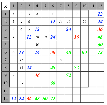 Déterminer les nombres qui figurent cinq fois dans la table du 12, six fois dans la table du 12 et ceux qui figurent deux fois dans la table du dix et quatre fois dans la table du 12.